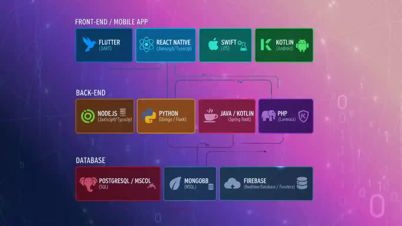 - اختيار التكنولوجيا (Tech Stack): تحديد لغات البرمجة والأدوات مثل Flutter أو React Native للواجهة وNode.js أو Django للخادم وقاعدة بيانات PostgreSQL أو MongoDB.